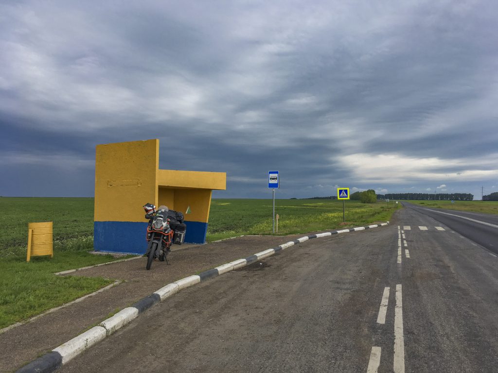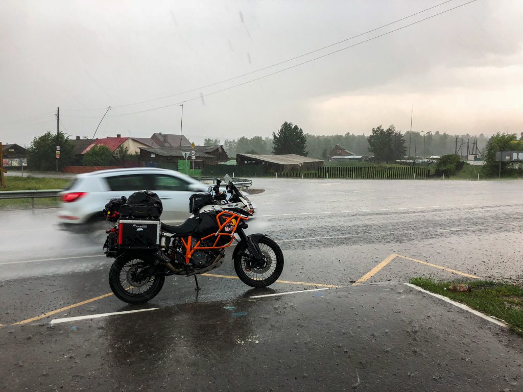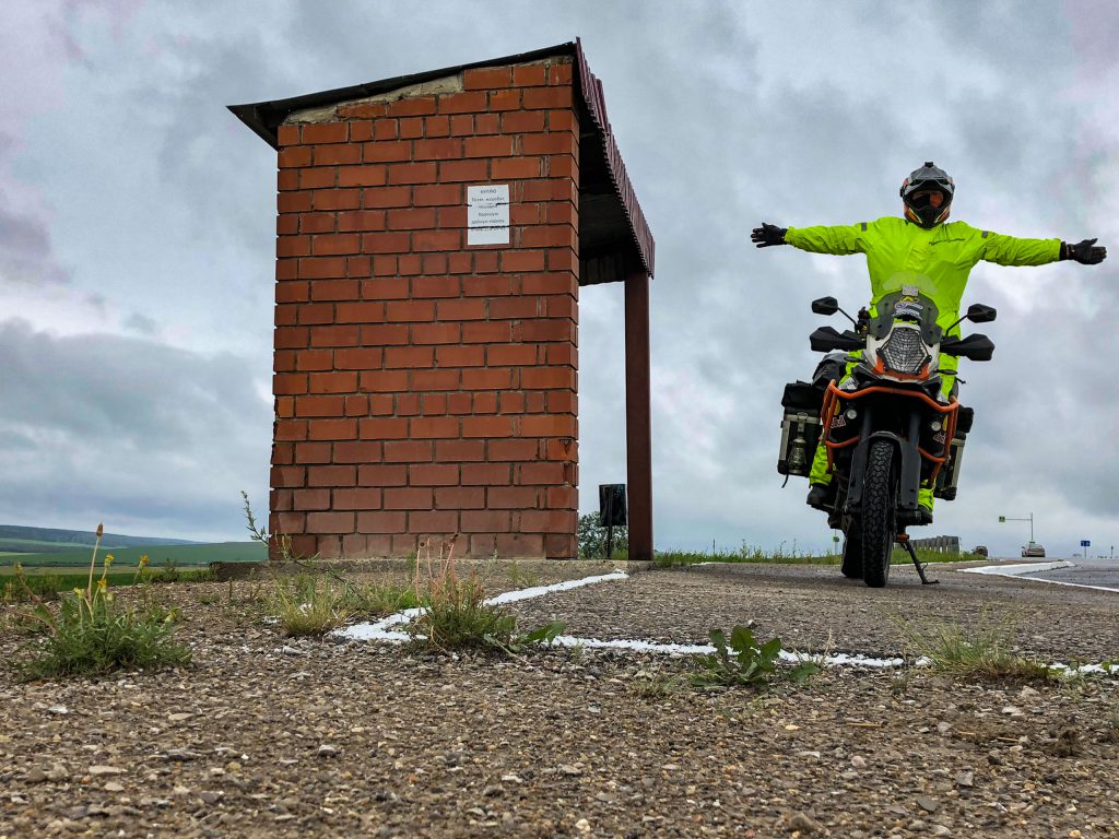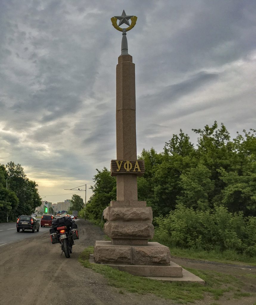 I think I become obsessed by the weather, I can’t stop looking at the sky this morning, and no way of knowing if it will be good or not … then rain suit or not? … Let’s go, and try without, we’ll see. Head full East, still on the M7. It’s funny to watch your GPS showing you: “destination 527km, in 432km turn left” Until the end I would have believed. Even stopping at the entrance of Ufa to make a quick souvenir shot I still believed. Well, he has decided otherwise, the manager of the weather all up there, and he didn’t do it light… never seen so hard rain. It’s stupid, we only had 2 km left. And there you say to yourself, if I hadn’t stopped doing this damn picture!…
