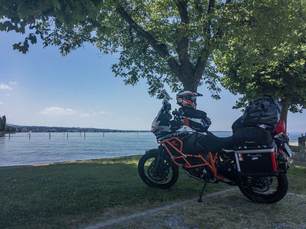 Today the dream comes true! First stage under a nice blue sky, crossing Switzerland from West to East. Good feeling with the bike, despite the weight of the luggages who changes the gravity center. I feel like an elephant in a porcelain store when it’s needed to move on a parking. Tomorow should be more animated… with not less than 3 country borders to cross.
